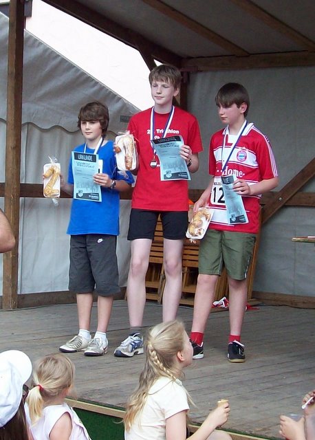 Ziehl-Abegg-Triathlon Waldenburg:Die Sieger vom Ilshofener Schülertriathlon starten als Staffel:Unsere Sieger vom Kindertriathlon haben zusammen mit Andrea Hajek als Staffel beim Triathlon in Waldenburg teilgenommen: Andrea Hajek: Schwimmen (500m) Florain Weber: Radfahren (20km) Felix Weber: Laufen (5km) Als zweit-jüngste Staffel belegten sie den super 19. Platz von insgesammt ca. 50 Staffeln..... In ein paar Jahren drüfen Sie dann (endlich) bei den "Großen" den Einzel-Triathlon mitmachen....